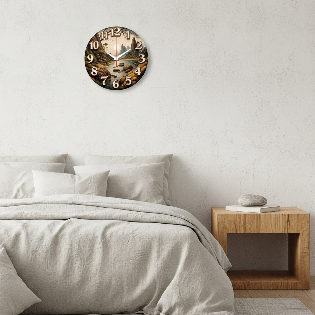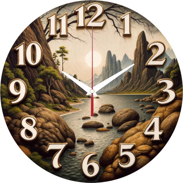 «Горный пейзаж» — умиротворяющие настенные часы с живописным видом на скалистый берег и далёкие горы на рассвете в спокойных природных оттенках. Крупные стилизованные цифры и контрастные белые стрелки обеспечивают хорошую читаемость. Подходит для гостиной, кабинета или загородного дома и станет прекрасным подарком для любителей природы и путешествий. Перейдите в нашу галерею, чтобы увидеть больше пейзажей.