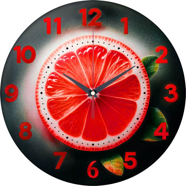 «Грейпфрут» — бодрящие настенные часы с гиперреалистичным фруктовым сюжетом в оттенках рубинового, графитового и изумрудного. Крупные красные цифры органично вписаны в дизайн, а лаконичные тёмные стрелки хорошо читаются на «цитрусовом» диске з точечной минутной разметкой. Подходит для кухни, бара и кафе; удачный подарок гурманам и поклонникам свежих вкусов. Смотрите в подборка.