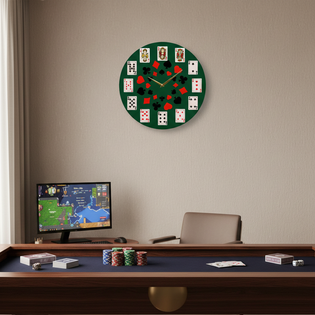 «Игральные карты» — азартные тематические настенные часы с покерным сюжетом: зелёный фон «под сукно», масти в центре; по кругу вместо цифр — реальные карточные метки от двойки до короля. В оттенках смарагдового, красного, чёрного и белого. Элегантные золотистые стрелки читаются с первого взгляда. Подходит для игровой, гостиной, лаунж-бара, бильярдной и кабинета; станет отличным подарком любителям покера, бриджа и настольных игр. Если близка такая игровая эстетика, загляните в подборку настенные часы.