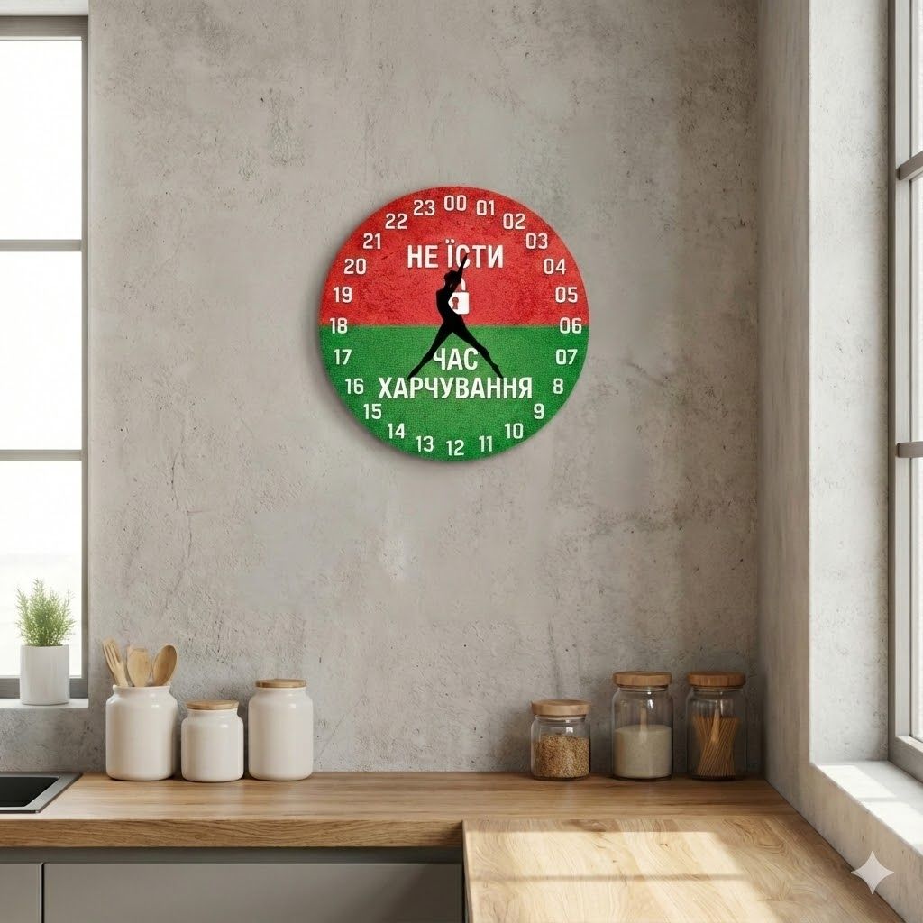 «Интервальное голодание» — Яркие настенные часы с изображением силуэта стройной фигуры и мотивирующим графиком диеты, в красных и зеленых оттенках. Белые контрастные цифры и особые стрелки обеспечивают отличную читаемость. Подходит в кухню, в комнату и в офис и станет полезным подарком для спортсменов и сторонников здорового образа жизни. Данная модель оснащена особым 24-часовым механизмом для удобного контроля режима дня. Контролируйте время с пользой