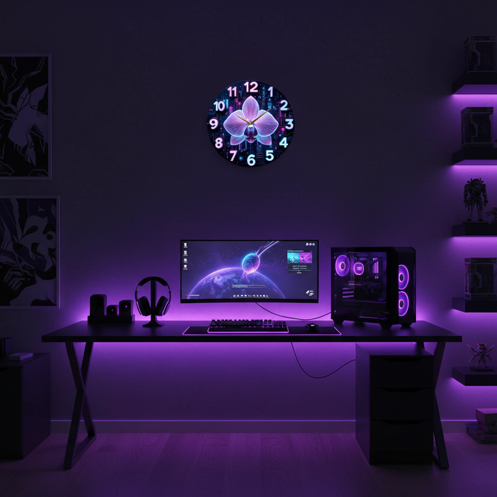 «Кибер-орхидея» — футуристические настенные часы с большой неоновой орхидеей на фоне тёмной микросхемы в стиле киберпанк, в ярких фиолетовых, розовых и синих оттенках. Светящиеся цифры и элегантные золотистые стрелки создают потрясающий контраст. Подходит для современного офиса, комнаты геймера или IT-студии и станет крутым подарком для любителя высоких технологий. Смотрите всю коллекцию настенных часов.