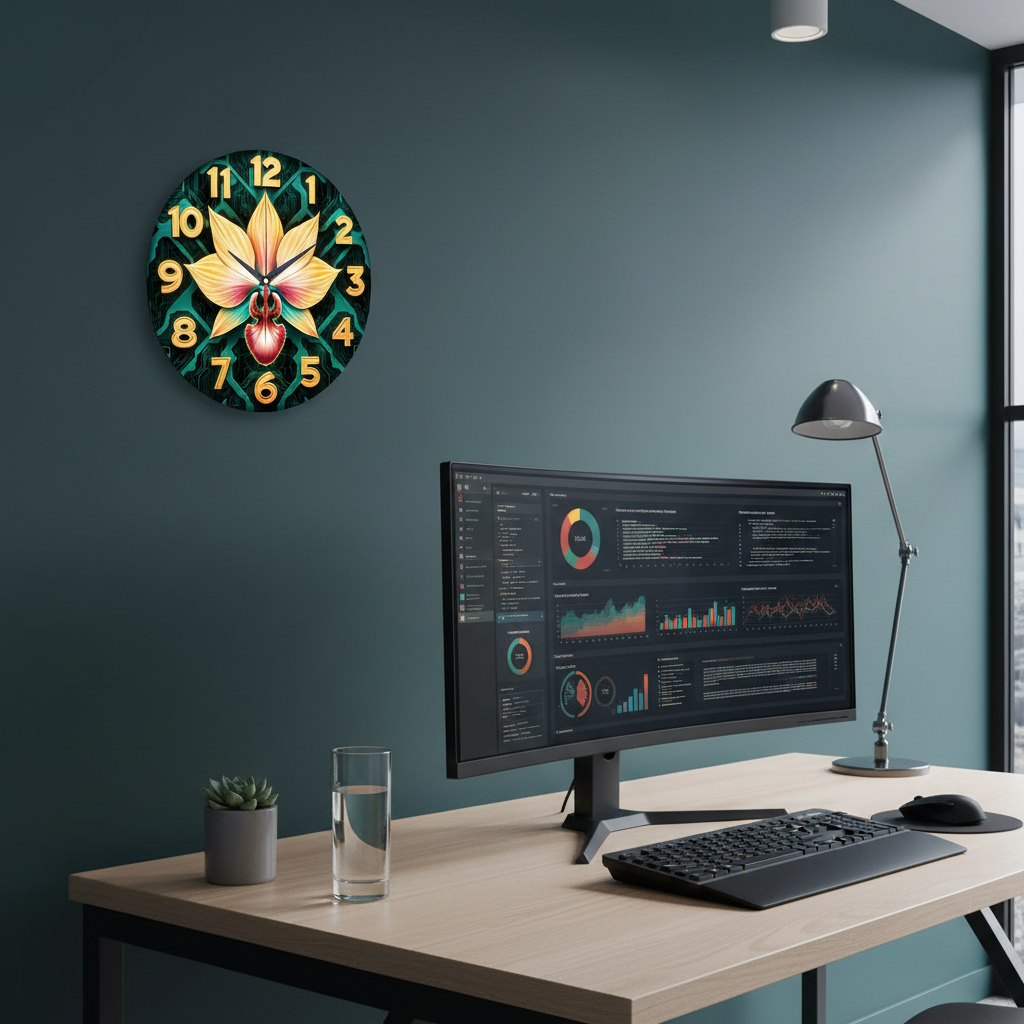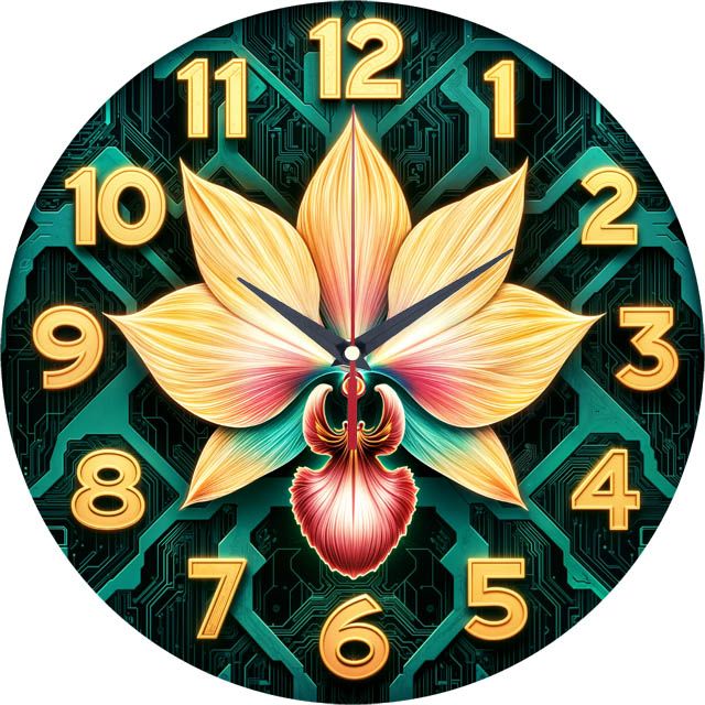 «Кибер-орхидея Неон» — футуристические настенные часы, сочетающие нежность орхидеи с технологичным орнаментом микросхемы, в насыщенных бирюзовых, золотых и оранжевых оттенках. Крупные золотые цифры и контрастные тёмные стрелки прекрасно читаются на фоне. Подходит для современного интерьера, офиса IT-компании или комнаты геймера и станет стильным подарком для любителя киберпанка. Смотрите каталог настенных часов.