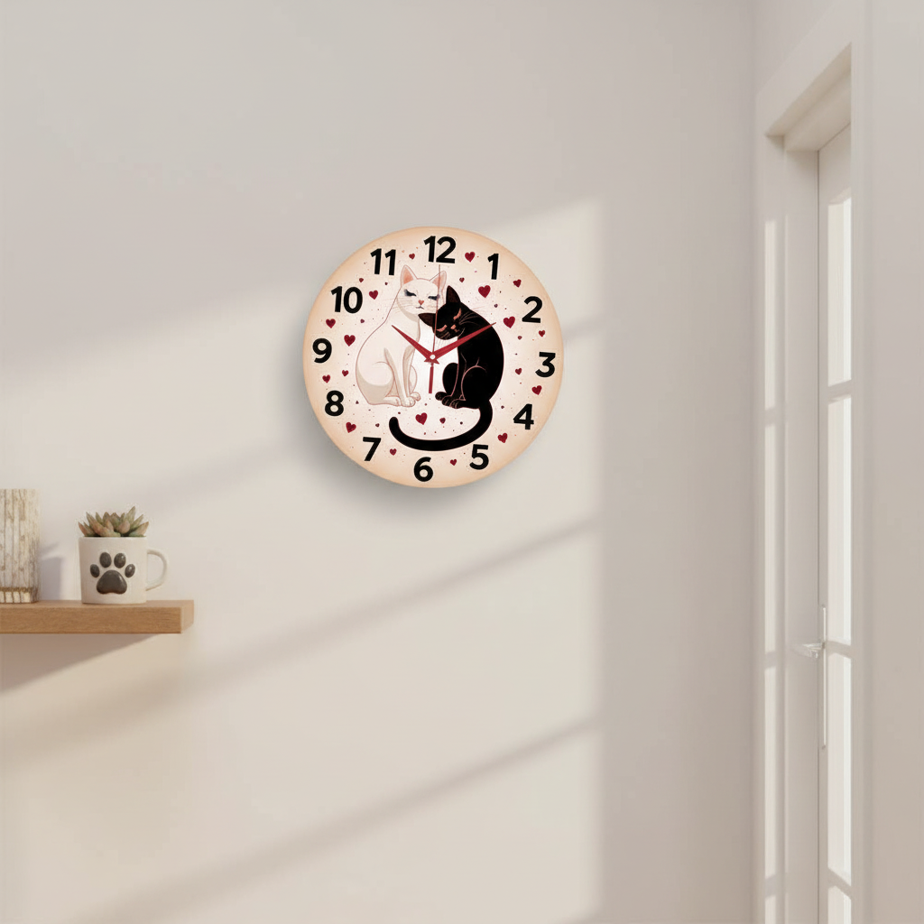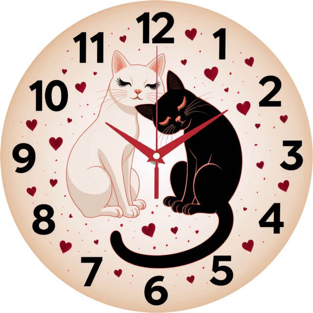 «Кошачья гармония» — нежные романтичные настенные часы с графической иллюстрацией: белый и чёрный котики, притулившиеся на фоне сердечек; по кругу — крупные контрастные тёмные цифры. В оттенках кремово-розового, белого, чёрного и винно-красного. Красные стрелки читаются с первого взгляда. Подходит для спальни, гостиной, детской, студии красоты и станет трогательным подарком влюблённым, на день рождения или к 14 февраля. Больше подобных сюжетов смотрите в подборке настенные часы.