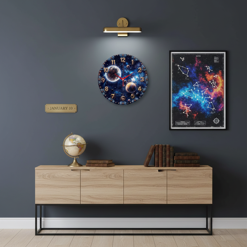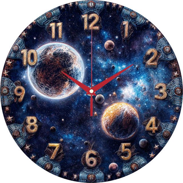 «Космический пейзаж» — атмосферные настенные часы с фантазийной космической сценой: туманности, планеты и звёздная пыль на глубоком ночном небе; по кругу — крупные контрастные цифры с лёгкой металлической патиною. В оттенках индиго, кобальтового и ночного синего с медно-золотыми акцентами. Красные стрелки читаются уверенно. Подходит для гостиной, кабинета, подростковой, креативного офиса или геймерской і станет вдохновляющим подарком любителям sci-fi и астрономии. Если близка космическая эстетика, загляните в подборку настенные часы.