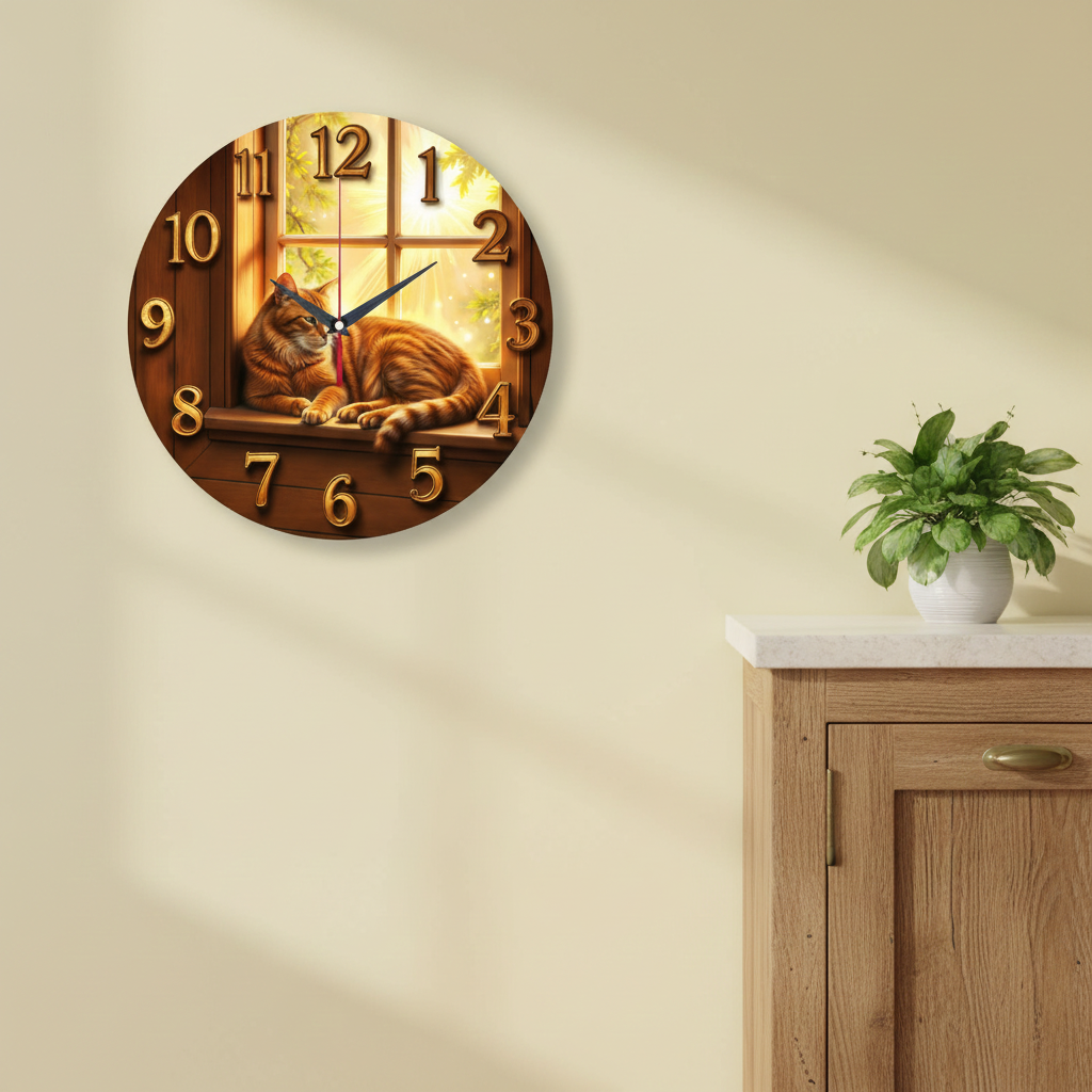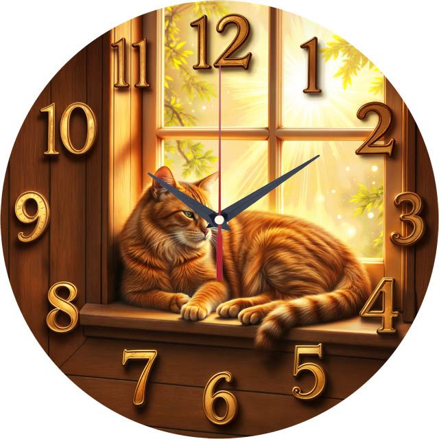 «Кот на подоконнике» — уютные, солнечные настенные часы с изображением рыжего кота, греющегося на деревянном подоконнике, в тёплых коричневых и золотисто-солнечных оттенках. Объёмные золотистые цифры и контрастные тёмные стрелки хорошо видны на фоне. Подходит для кухни, гостиной в стиле кантри или дачи и станет прекрасным подарком для любителя кошек и домашнего уюта. Выбирайте лучшие настенные часы в интернет-магазине.