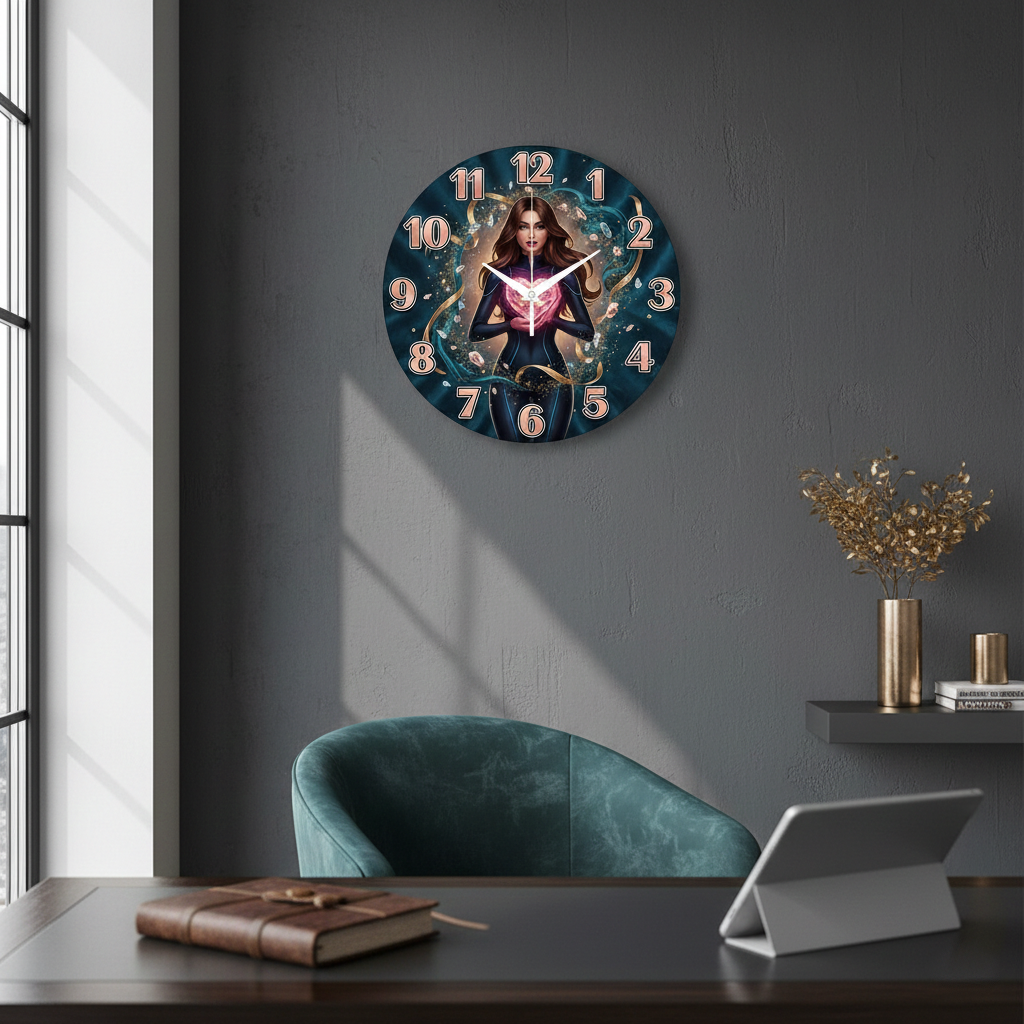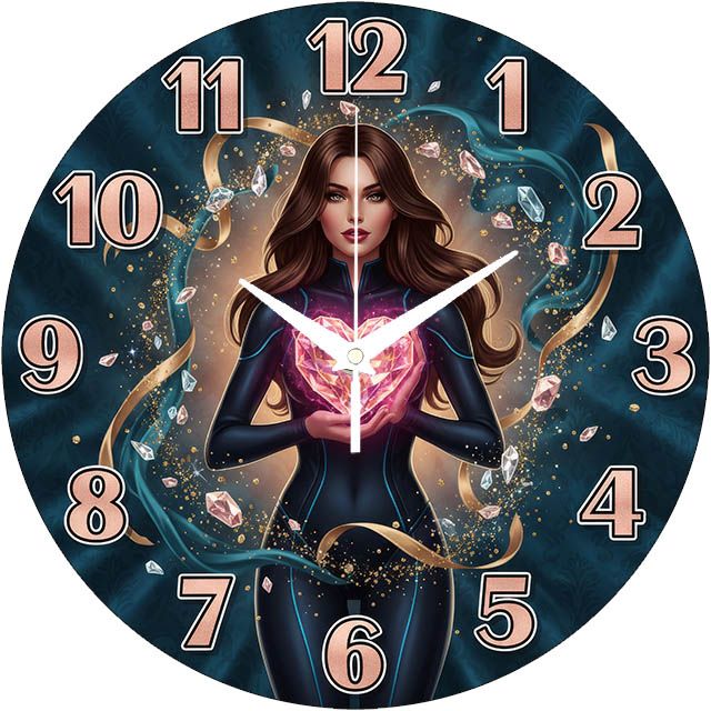 «Кристальное сердце» — Стильные настенные часы с изображением загадочной девушки, держащей сияющее драгоценное сердце в окружении кристаллов, в глубоких синих и розовых оттенках. Крупные контрастные цифры и белые стрелки обеспечивают отличную видимость времени. Подходит для спальни, зала и комнаты и станет оригинальным подарком для девушки или подруги, если вы решите эти часы на стену купить для украшения интерьера.