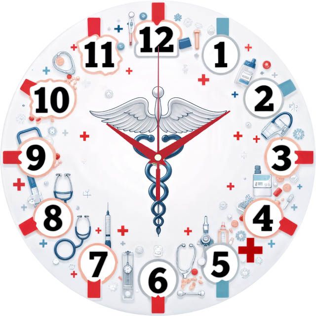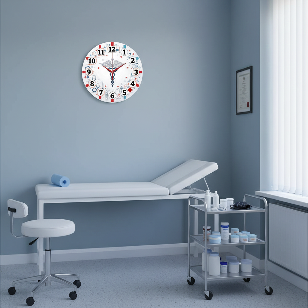 «Медицинские» — спокойные профессиональные настенные часы с медицинским сюжетом: кадуцей в центре, пиктограммы инструментов и кресты, выполненные в оттенках белого, красного, синего и стального. По кругу — крупные контрастные цифры на светлых метках; красные стрелки хорошо читаются на чистом фоне. Подходит для кабинета врача, клиники, лаборатории, аптеки и домашнего мед-уголка; отличный подарок медикам, студентам-медикам и преподавателям. Быстрая справка по разделу.