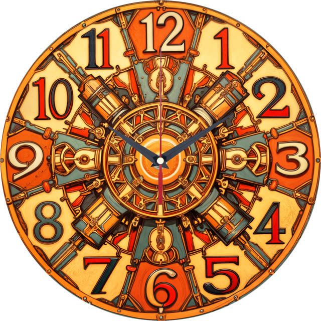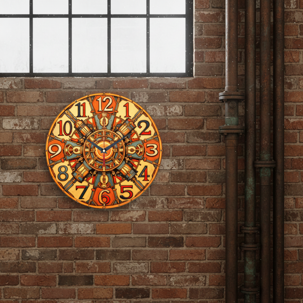 «Механическое солнце» — сложные, индустриальные настенные часы с замысловатым орнаментом в стиле стимпанк, напоминающим двигатель или солнце, в тёплых оранжевых, жёлтых и патиновых (зелёно-синих) оттенках. Крупные стилизованные цифры и контрастные тёмные стрелки хорошо читаются. Подходит для лофта, кабинета, бара или комнаты в стиле стимпанк и станет оригинальным подарком для инженера или поклонника стимпанка. Смотрите всю подборку настенных часов.
