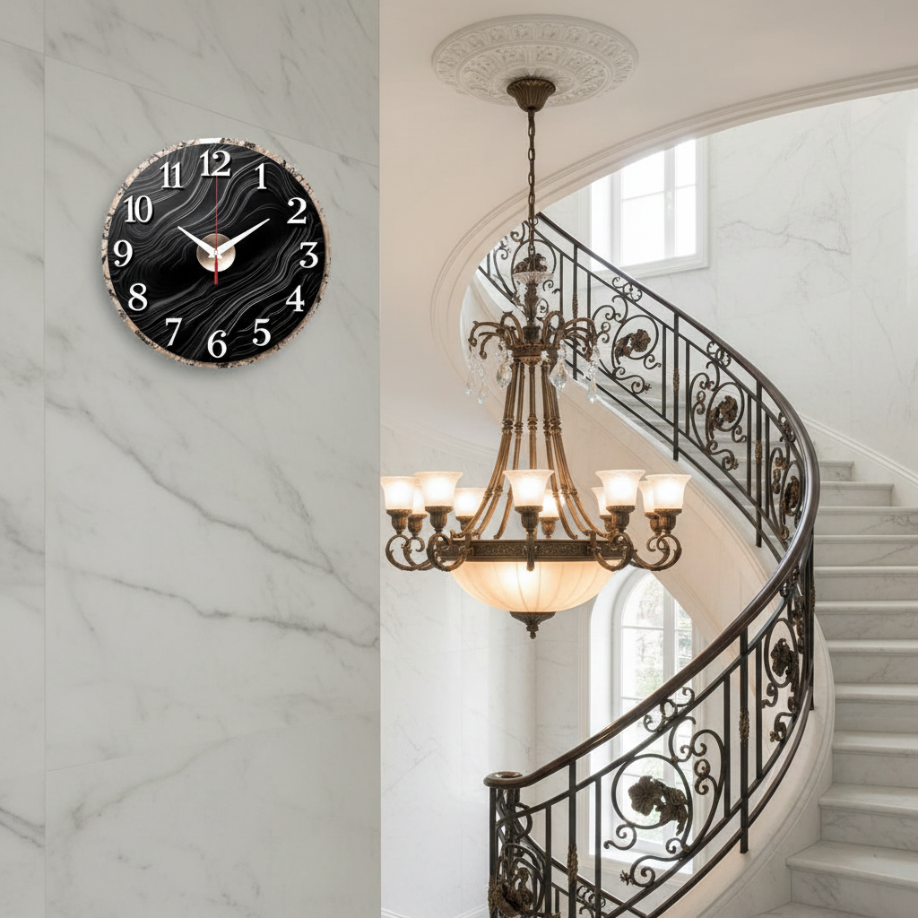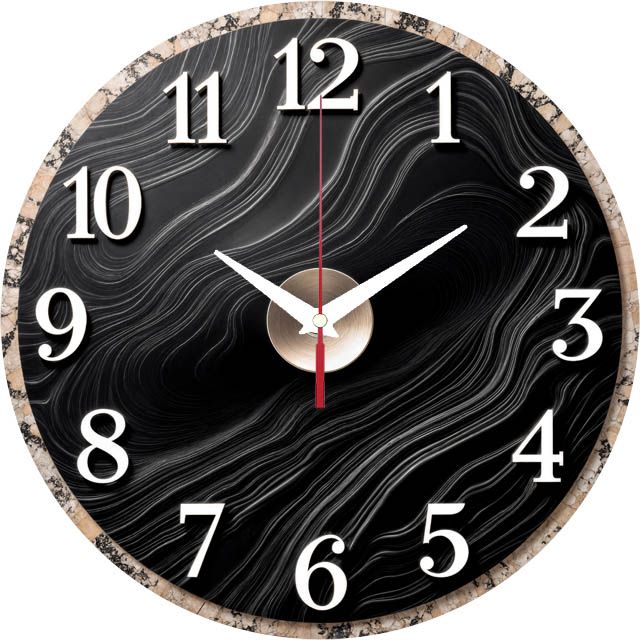 «Мраморный черный» — сдержанные, статусные настенные часы с мраморной фактурой и тонкими волнистыми прожилками в глубоком матовом черном. В оттенках угольно-черного, графитового, светло-серого и теплого камня. По кругу — крупные контрастные классические цифры; лаконичные белые стрелки уверенно читаются на темном фоне. Подходит для минимализма, модерна, сканди и лофта, кабинета и гостиной; станет отличным подарком перфекционистам и ценителям природных текстур. Смотрите больше в подборке настенные часы.