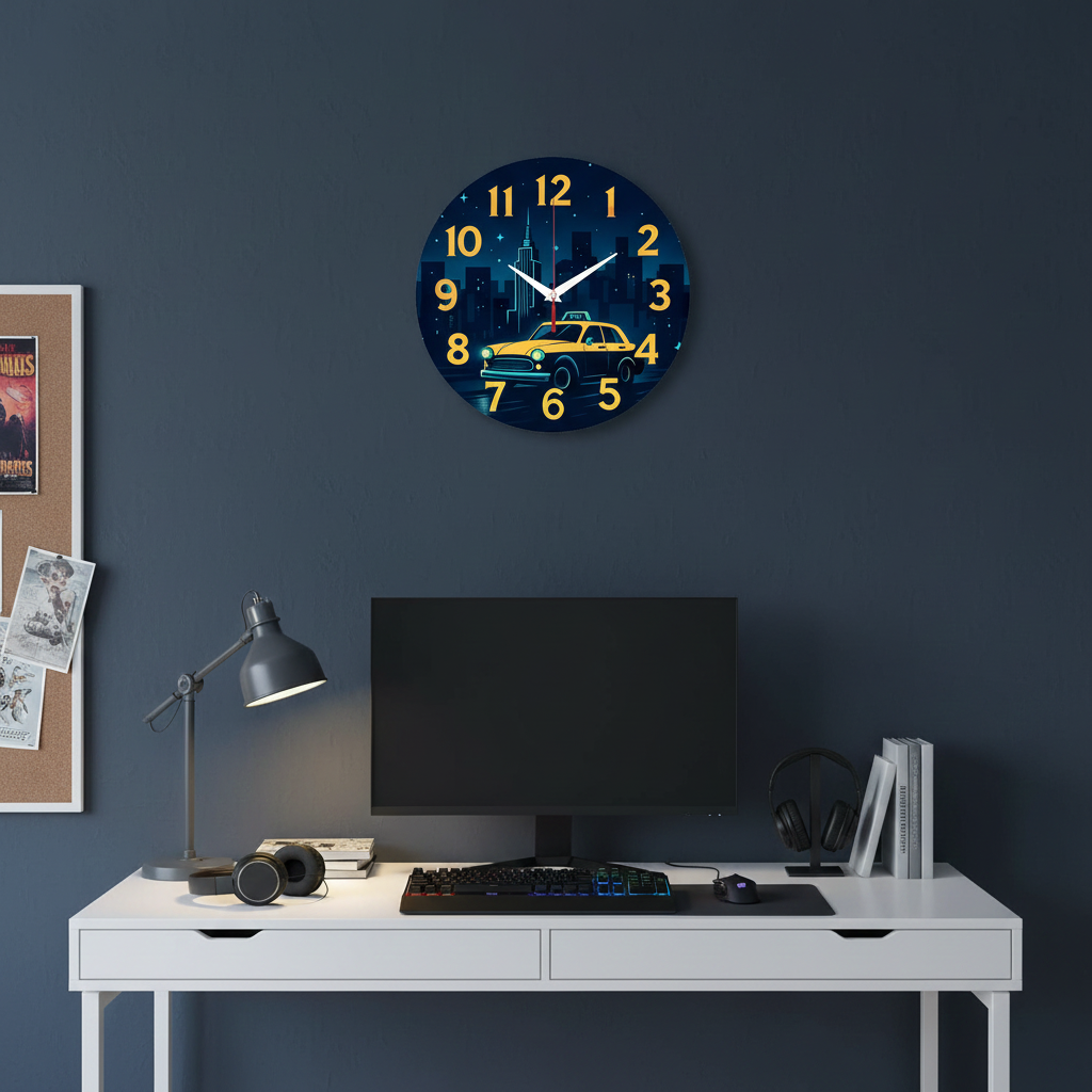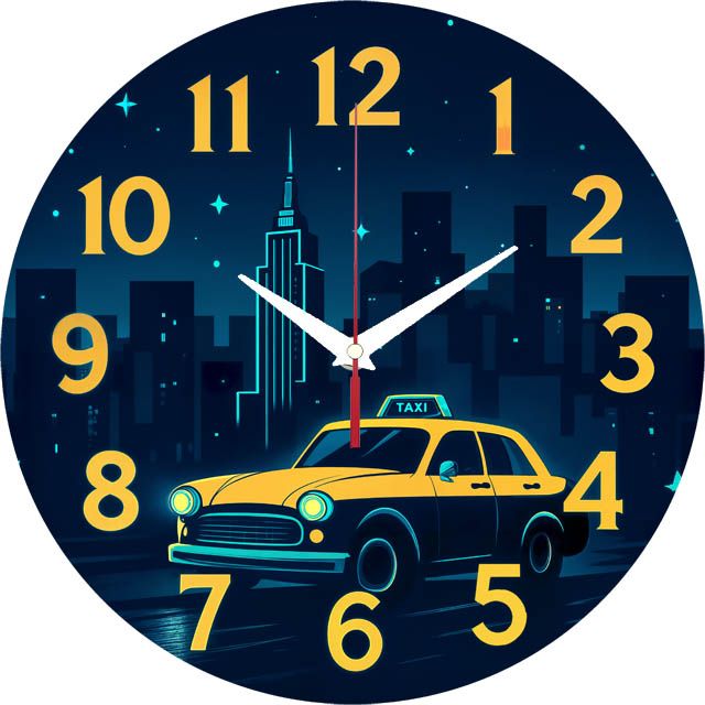 «Ночное такси» — стильные урбанистические настенные часы с изображением жёлтого такси на фоне ночного мегаполиса в глубоких синих и ярких жёлтых оттенках. Крупные жёлтые цифры и контрастные белые стрелки отлично видны на тёмном фоне. Подходит для лофта, кабинета, комнаты подростка или бара и станет отличным подарком для автомобилиста или ценителя городской романтики. Смотрите все модели часов на стену.