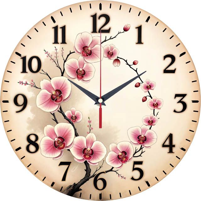 «Орхидея в цвету» — нежные, элегантные настенные часы с изображением ветки цветущей розовой орхидеи в винтажном стиле, в пастельных бежевых и розовых оттенках. Крупные чёрные арабские цифры и контрастные тёмные стрелки хорошо читаются на светлом фоне. Подходит для спальни, гостиной в стиле шебби-шик или салона красоты и станет прекрасным подарком для ценителей цветов. Смотрите настенные часы — главная страница.
