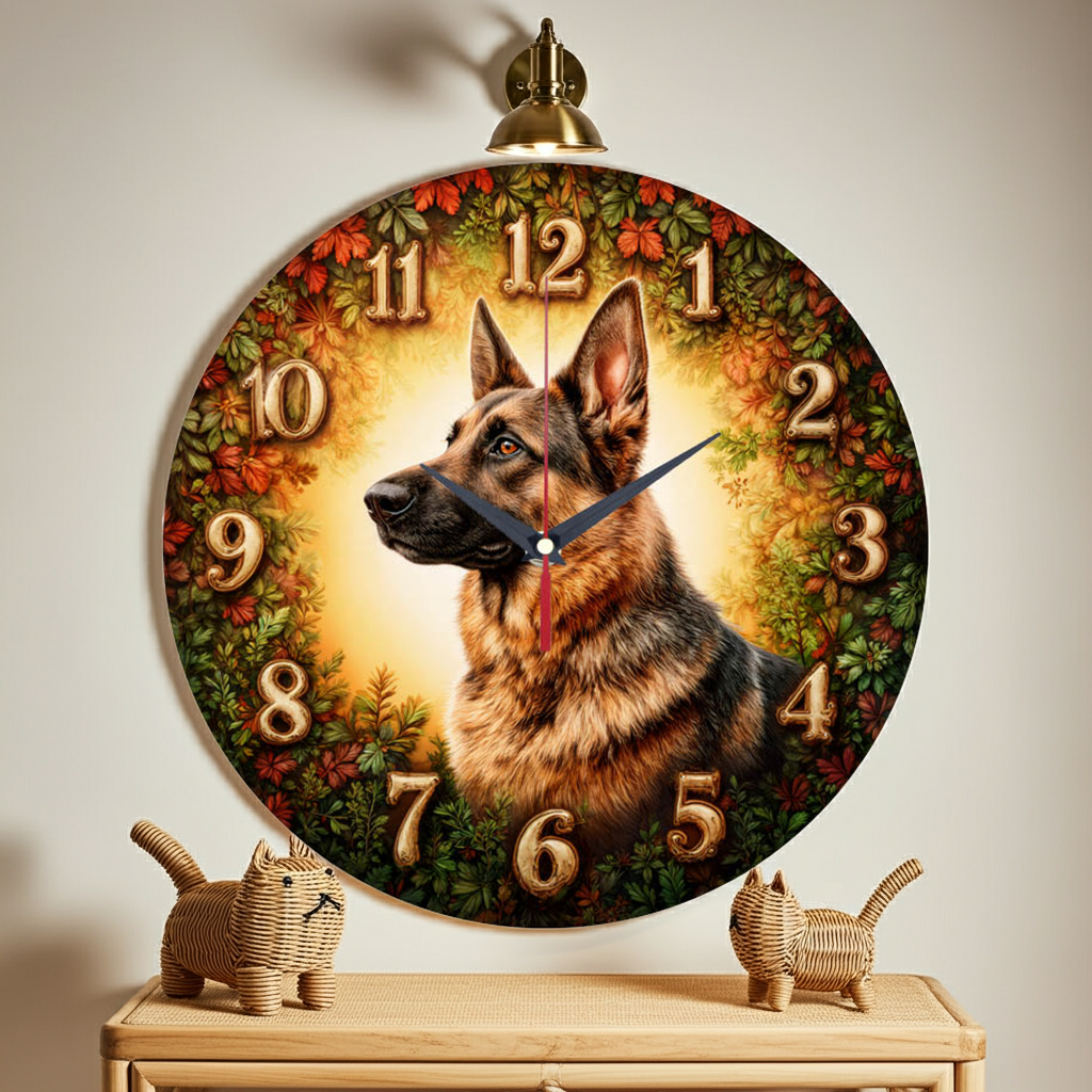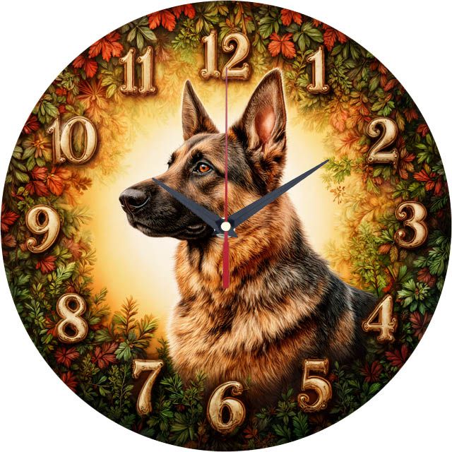 «Овчарка» — тёплые атмосферные настенные часы с портретом верного друга: внимательная овчарка на фоне осенней листвы; по кругу — крупные контрастные объёмные цифры с бронзовым патинированием, органично вписанные в композицию. В оттенках янтарного, мшисто-зелёного, тёплого золота и шоколадно-коричневого. Лаконичные тёмные стрелки читаются. Подходит для гостиной, холла, кабинета, загородного дома и станет удачным подарком владельцам собак, кинологам и всем, кто любит животных. Если откликается такой природный акцент, загляните в подборку настенные часы.