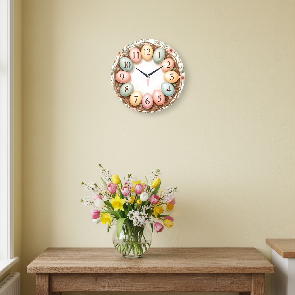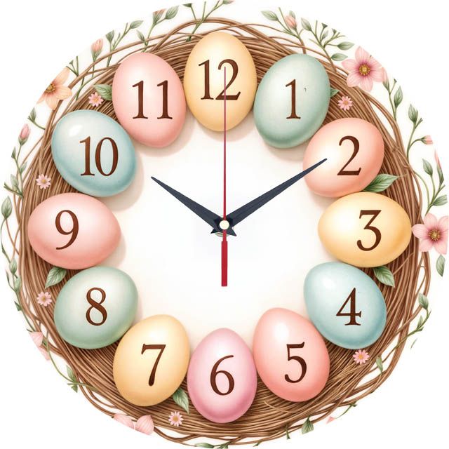 «Пасхальный венок» — нежные, весенние настенные часы с изображением гнезда с разноцветными пасхальными яйцами в пастельных розовых, голубых и жёлтых оттенках. Тёмные цифры нанесены прямо на яйца, контрастные тёмные стрелки хорошо видны. Подходит для кухни, столовой или детской, станет прекрасным сезонным декором к Пасхе или подарком для хозяйки. Смотрите всю подборку часов для дома.