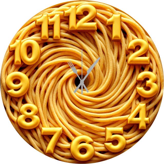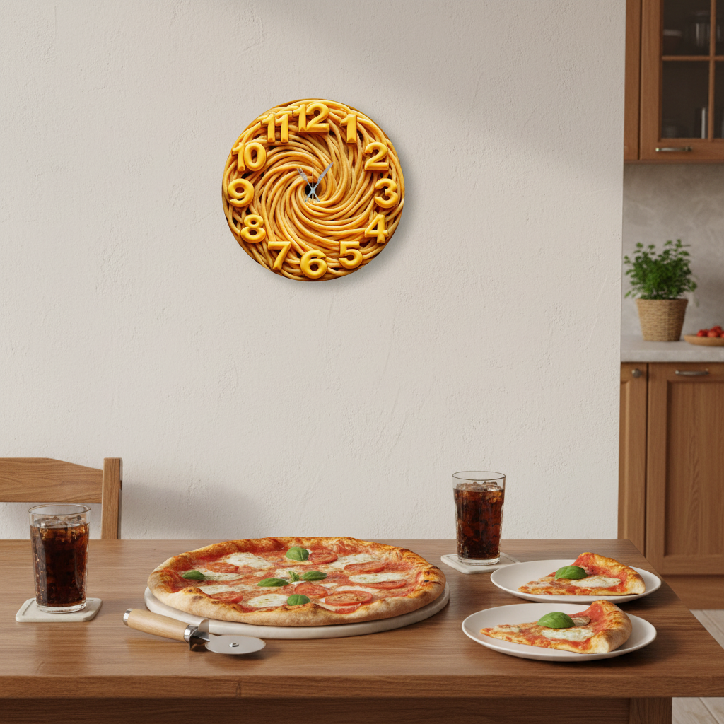 «Паста с сыром» — аппетитные кухонные настенные часы с динамичным сюжетом: спираль из пасты на тёплом фоне, по кругу — крупные контрастные объёмные цифры «сырного» золотисто-жёлтого оттенка. В палитре мёд, карамель, топлёное масло и светлая ваниль. Серебристые стрелки в форме вилки и ножа читаются с первого взгляда. Подходит для кухни, столовой, кафе/пицерии та фуд-зоны; удачный подарок гурманам и любителям итальянськой кухни. Больше кулинарных сюжетов смотрите в подборке настенные часы.