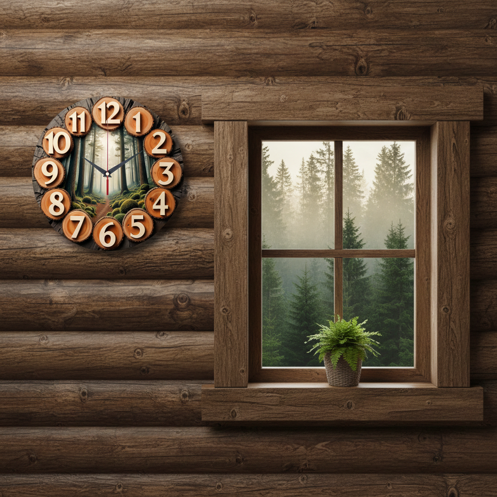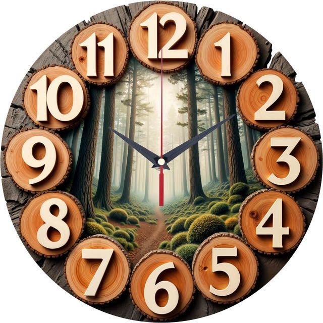 «Подарок леснику» — умиротворяющие, атмосферные настенные часы с изображением туманного леса в центре и цифрами на деревянных спилах в натуральных древесных, зелёных и бежевых оттенках. Объёмные бежевые цифры на спилах и контрастные тёмные стрелки хорошо читаются. Подходит для загородного дома, дома в экостиле, кабинета или дачи и станет прекрасным подарком для лесника, охотника или любого, кто любит природу. Смотрите все настенные часы.