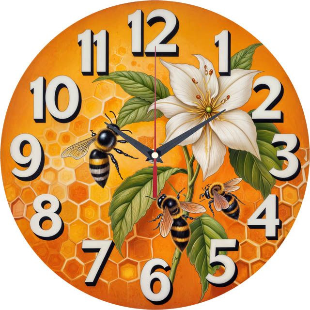 «Подарок пчеловоду» — тёплые, солнечные настенные часы с изображением пчёл на белой лилии на фоне медовых сот, в насыщенных оранжевых и жёлтых оттенках. Крупные объёмные белые цифры и контрастные тёмные стрелки хорошо читаются на ярком фоне. Подходит для кухни, дачи или загородного дома и станет отличным подарком для пчеловода или любителя мёда. Смотрите каталог настенных часов.