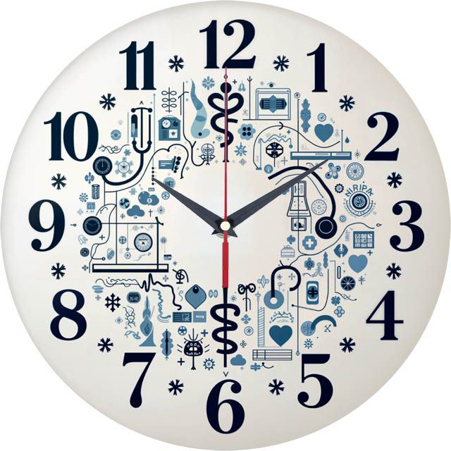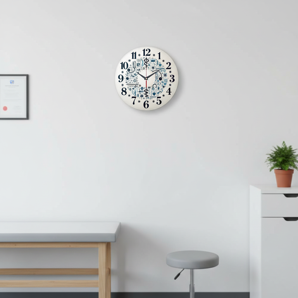 «Подарок врачу» — оригинальные, тематические настенные часы с замысловатым орнаментом из медицинских символов (стетоскоп, кадуцей, сердце, колбы) в синих и чёрных оттенках на белом фоне. Крупные классические чёрные цифры и контрастные тёмные стрелки прекрасно читаются. Подходит для кабинета врача, клиники, ординаторской и станет прекрасным подарком для врача, медсестры, студента-медика или любого работника сферы здравоохранения. Выбирайте, где купить настенные часы онлайн.