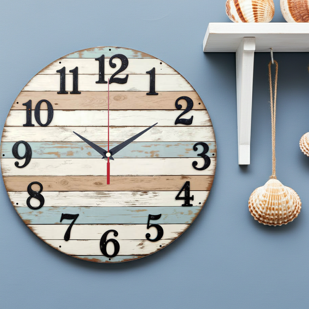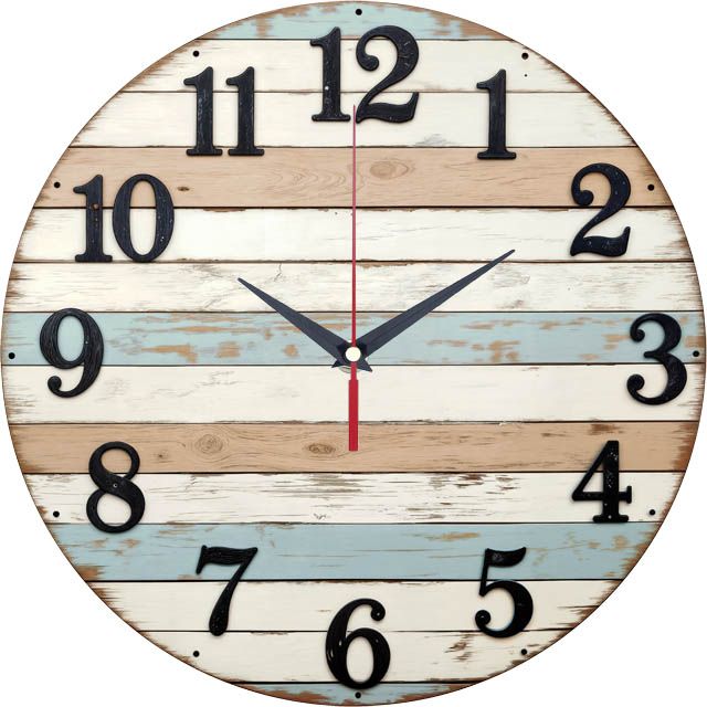 «Полосатая фактура» — уютные, винтажные настенные часы с дизайном, имитирующим горизонтальные крашеные доски с эффектом потёртости, в пастельных бежевых, голубых и белых тонах. Крупные чёрные арабские цифры и контрастные тёмные стрелки прекрасно читаются. Подходит для кухни в стиле прованс, загородного дома или интерьера в морском стиле и станет прекрасным подарком для любителя стиля шебби-шик. Смотрите всю подборку настенных часов.