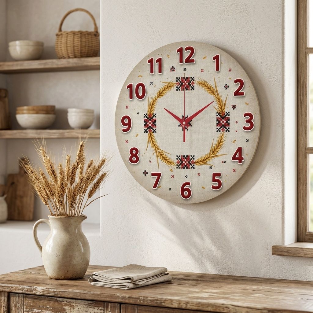 «Пшеничный оберег» — Уютные настенные часы с изображением золотых колосьев и этнического узора, в бежевых и красных оттенках. Крупные красные цифры и изящные тонкие стрелки. Подходит для кухни, гостинной, прихожей и станет теплым подарком для родителей, друзей и близких, а чтобы увидеть больше вариантов, вы можете вернуться в категорию в нашем магазине.
