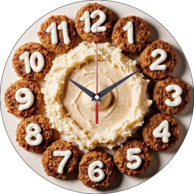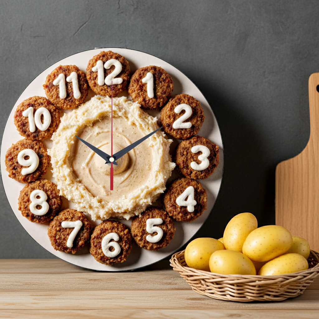«Пюре с котлетами» — игривые кухонные часы: по кругу — «котлетки» с объёмными белыми цифрами из сметаны, в центре — кремовое картофельное пюре. Белые контрастные цифры и аккуратные тёмные стрелки с красной секундной хорошо читаются на «тарелке»-фоне. Подходит для кухни, кафе и фуд-зон; отличный подарок гурманам и поварам. Больше таких идей смотрите в подборке часы картина.