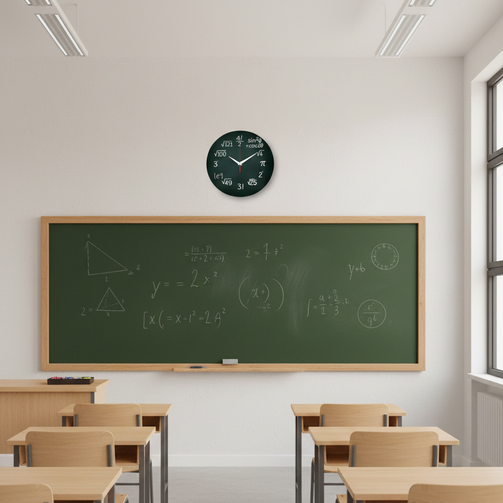 «С формулами» — вдохновляющие настенные часы со «школьной доской»: вместо цифр — математические выражения мелом. В оттенках тёмно-зелёного, графитового и мелово-белого. По кругу — аккуратные точечные метки; тонкие белые стрелки читаются мгновенно на тёмном фоне. Подходит для кабинета, класса, коворкинга, STEM-зоны и домашнего офиса; удачный подарок учителю, студенту и олимпиаднику. Перейдите у осмотр.