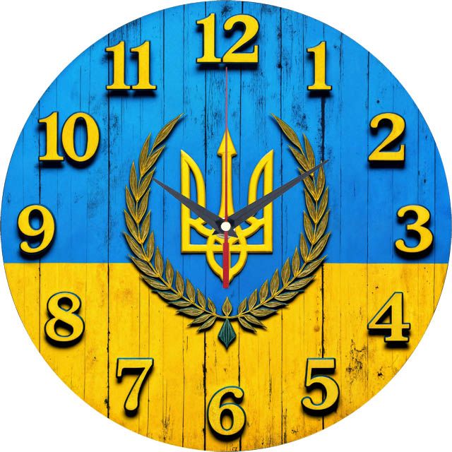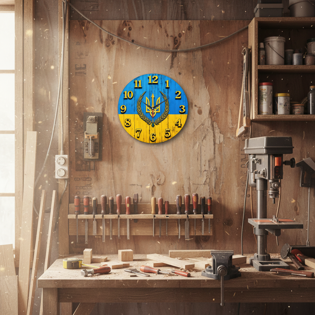 «С гербом Украины» — гордые настенные часы с патриотическим сюжетом: тризуб и лавровый венок на деревянной фактуре флага в оттенках сине-жёлтого с золотистыми акцентами. По кругу — крупные жёлтые объёмные цифры с мягкой тенью; лаконичные тёмные стрелки хорошо читаются на фоне. Подходит для гостиной, кабинета, прихожей и офиса; удачный подарок патриотам, волонтёрам и к новоселью. Смотрите у нас в портфолио.