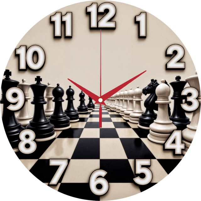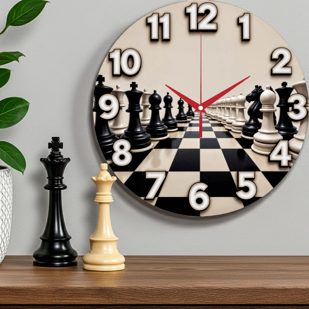 «Шахматы» — строгие интеллектуальные настенные часы с перспективной композицией на шахматной доске: фигуры белых и чёрных тянутся к центру; по кругу — крупные контрастные объёмные цифры с тёмной окантовкой. В оттенках молочно-бежевого, графитового и чёрного с акцентом красных стрелок. Подходит для кабинета, гостиной, игровой, класса логики или шахматного клуба и станет отличным подарком любителям стратегий и классического декора. Если откликается такой сдержанный акцент, загляните в подборку настенные часы.