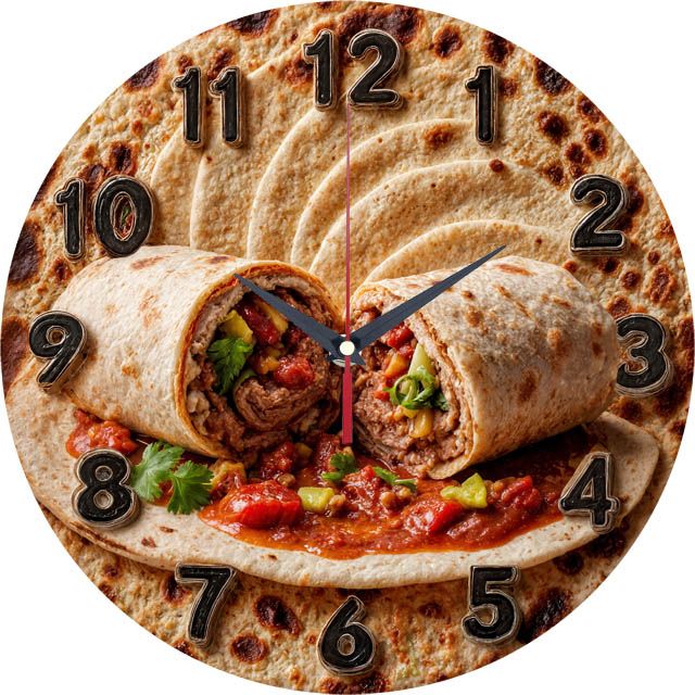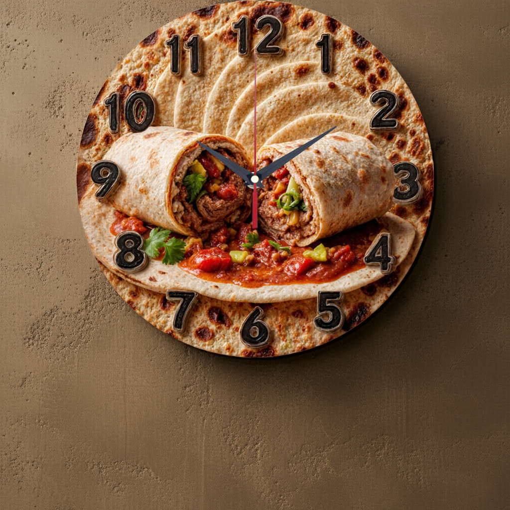 «Шаурма» — аппетитные street-food настенные часы с фуд-артом: на фоне румяного лаваша — сочный ролл с мясом, овощами и соусом; по кругу — крупные органично вписанные арабские цифры. В оттенках тёплого песочно-бежевого, карамельного и томатно-красного с зелёными акцентами. Тёмные стрелки и цифры читаются комфортно. Подходит для кухни, кафе, закусочных и фуд-кортов и станет удачным подарком гурманам и любителям street-food. Если близка тема локального крафта, загляните в подборку часы украинского производства.