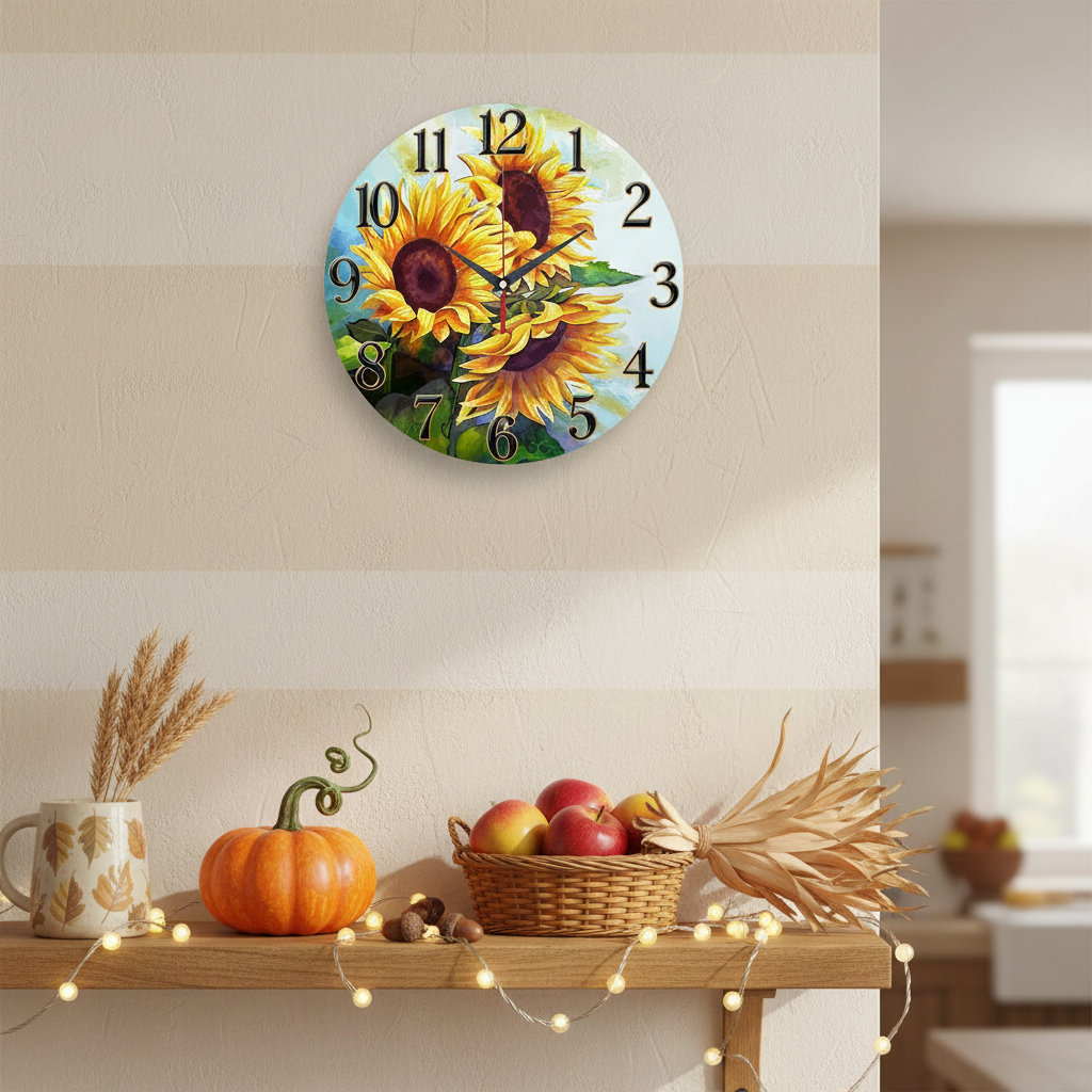 «Солнечный букет» — жизнерадостные настенные часы с живописными подсолнухами в технике декоративной живописи, в оттенках золотисто-жёлтого, янтарного, травянисто-зелёного та небесно-голубого. По кругу — крупные контрастные цифры с тёплым золотистым кантом; тёмные стрелки хорошо читаются на светлом фоне. Подходит для кухни, столовой, гостиной, интерьеров в стиле кантри, прованс и эко; станет отличным подарком хозяйке дома, садоводам и на новоселье. Смотрите всю коллекцию.