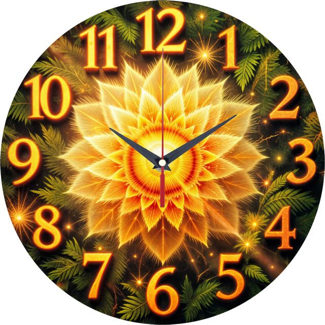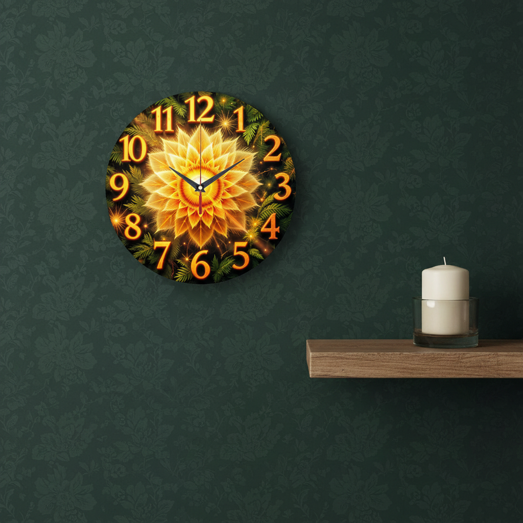 «Цветок Папоротника» — волшебные, мистические настенные часы с изображением легендарного цветка папоротника, сияющего, как солнце, в окружении тёмных листьев и искр, в насыщенных золотых, оранжевых и зелёных оттенках. Крупные "горящие" оранжевые цифры и контрастные тёмные стрелки прекрасно читаются. Подходит для гостиной, спальни, кабинета или интерьера в стиле этно/фэнтези и станет прекрасным подарком для ценителя славянской мифологии или как талисман на удачу. Смотрите наш каталог.