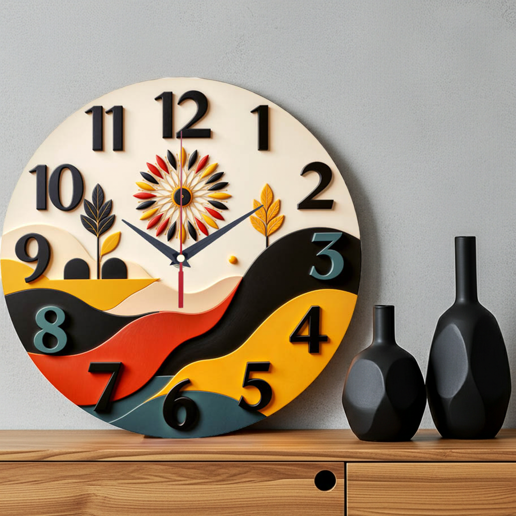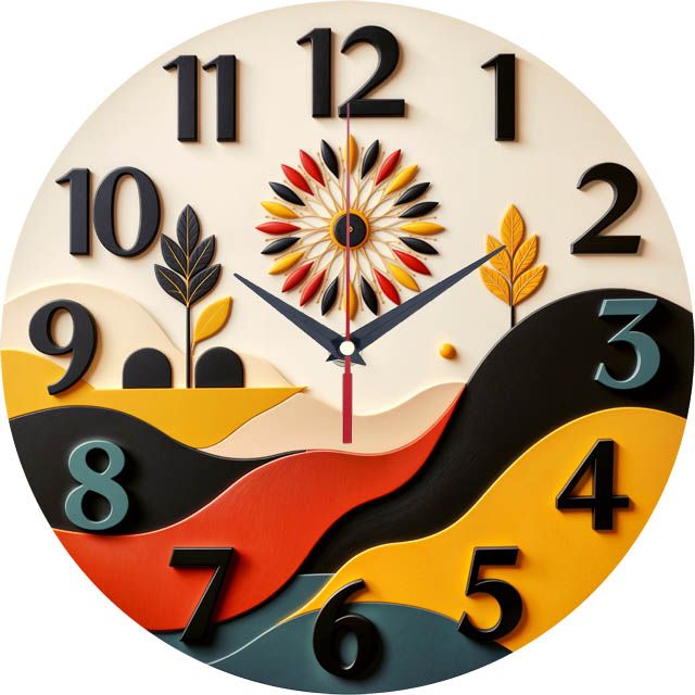 «Украинский минимализм» — стильные арт-часы с абстрактным пейзажем и стилизованным подсолнухом в жёлтых, красных, чёрных и синих оттенках. Объёмные разноцветные цифры и контрастные тёмные стрелки прекрасно читаются на светлом фоне. Подходит для современного интерьера, офиса или гостиной в стиле этно-модерн и станет ярким акцентом или подарком для ценителя современного искусства. Смотрите полный список настенных часов.