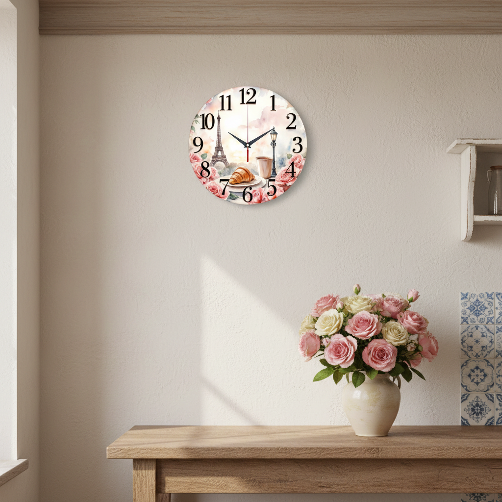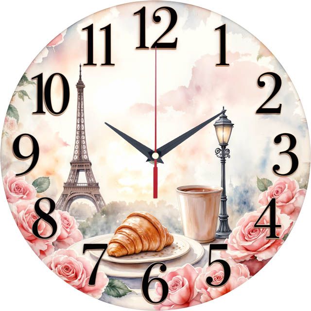 «Утро с круассаном» — романтичные настенные часы с акварельным парижским пейзажем (Эйфелева башня, круассан и кофе), обрамлённым розами, в нежных розовых и пастельных оттенках. Классические чёрные арабские цифры и тёмные стрелки отлично читаются на светлом фоне. Подходит для кухни, кафе, гостиной в стиле прованс и станет прекрасным подарком для мечтательной натуры. Смотрите другие часы на стену в нашем ассортименте.