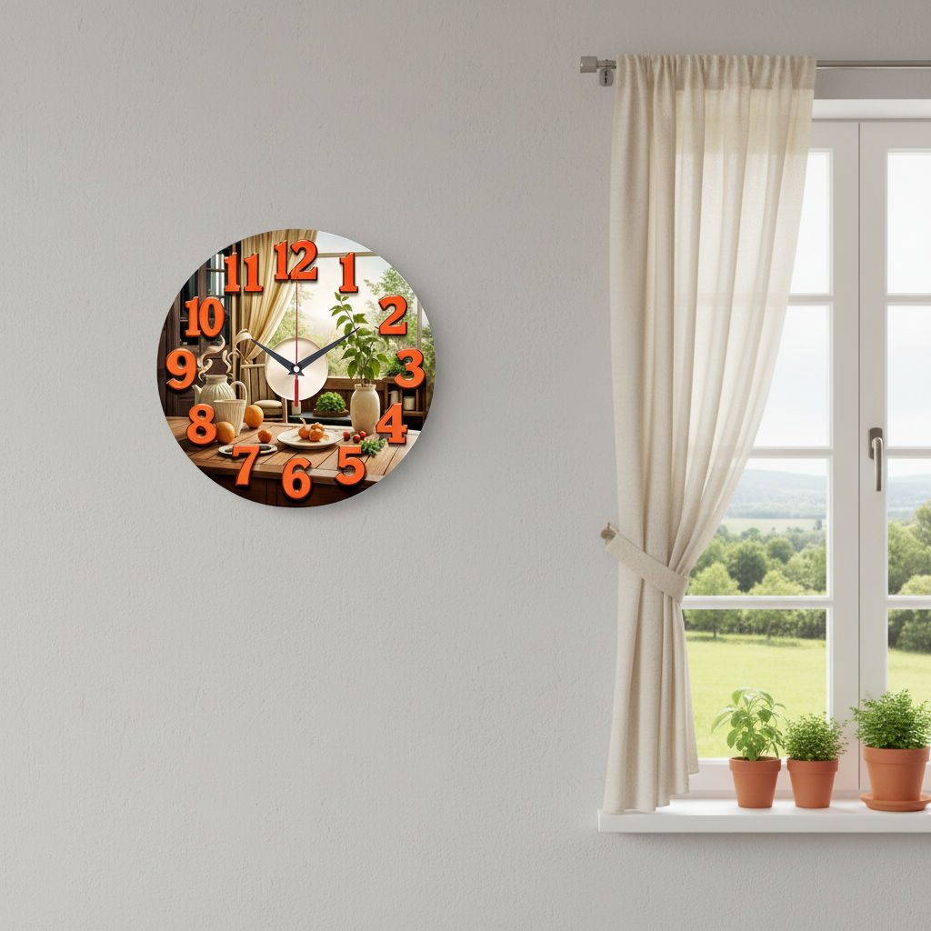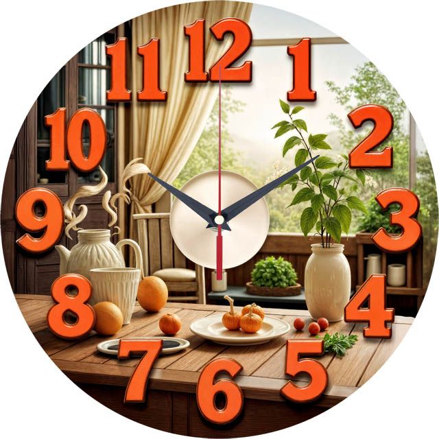 «Время обеда» — тёплые домашние настенные часы с кухонным натюрмортом: солнечный стол, фрукты, зелень и керамика у окна; в центре — мини-«тарелка» с приборными стрелками. По кругу — крупные контрастные объёмные цифры терракотово-оранжевого оттенка. Палитра — кремовый, цвет светлого дерева, терракота и зелень трав. Подходит для кухни, столовой, дачного дома и кафе; удачный подарок хозяйкам, гурманам и любителям уютного кантри-декора. Если откликается такой домашний акцент, загляните в подборку настенные часы.
