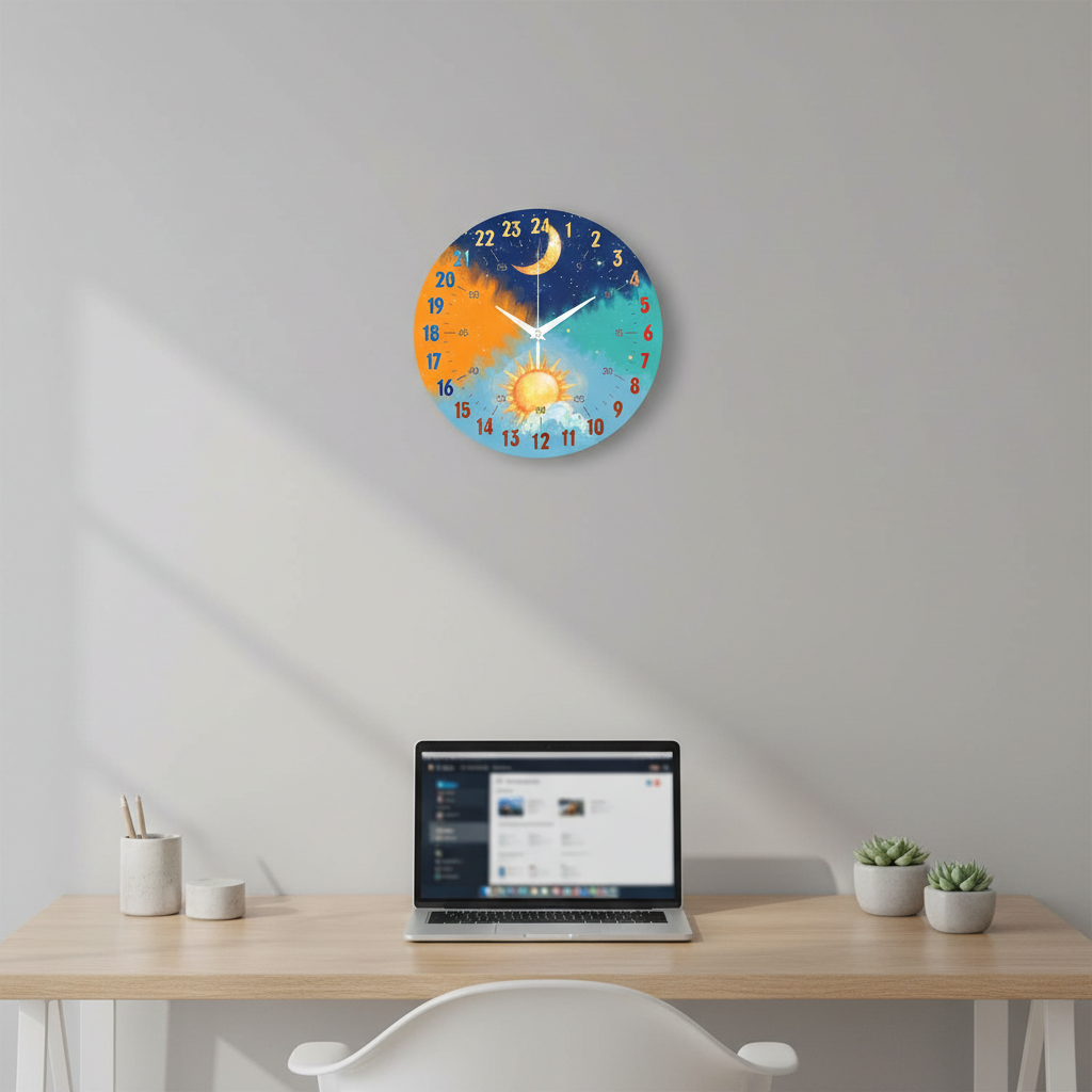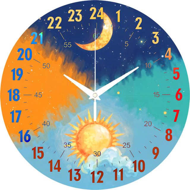 «Время суток» — концептуальные 24-часовые настенные часы, показывающие фазы дня. Циферблат разделён на четыре зоны: ночь , рассвет, день и закат. Широкая светло-бирюзовая зона символизирует диапазон рассветов в течение года, а тёплая оранжевая — диапазон закатов. Это позволяет интуитивно ощущать время суток, даже находясь в помещении без окон. Крупные цифры и контрастные белые стрелки прекрасно читаются. Подходит для офиса, кабинета, детской или спальни. Станет отличным подарком для человека, ценящего концептуальные вещи, или для ребёнка, изучающего 24-часовой формат. Перейдите в наш каталог.