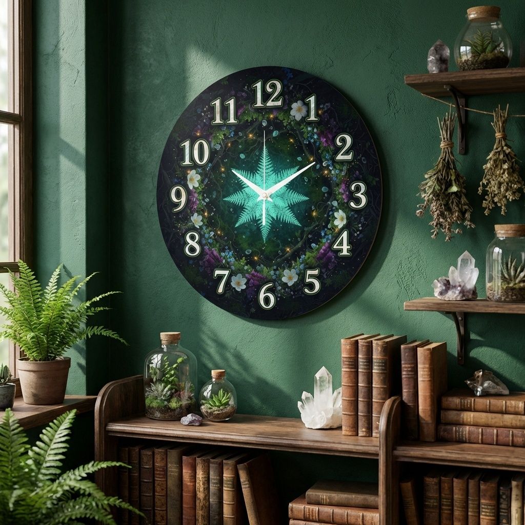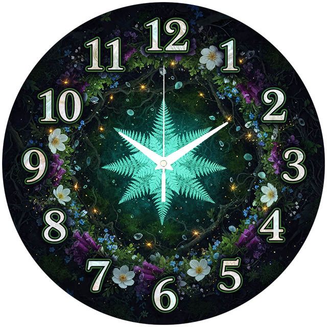 «Зачарованный лес» — Уютные настенные часы с изображением светящегося папоротника в окружении цветов и сказочных огней, в изумрудных и тёмных оттенках. Крупные контрастные арабские цифры и белые фигурные стрелки обеспечивают отличную читаемость. Подходит для спальни, гостинной, комнаты и станет прекрасным подарком для детей и взрослых, поэтому предлагаем вам купить часы в интернет-магазине.