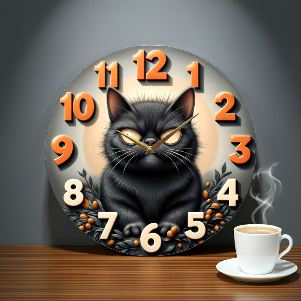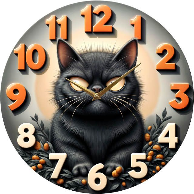 «Злой кот» — забавные настенные часы с изображением сердитого, но милого чёрного кота в чёрных, оранжевых и серых оттенках. Объёмные разноцветные цифры (оранжевые и бежевые) и элегантные золотистые стрелки создают яркий контраст. Подходит для кухни, кабинета или комнаты подростка и станет весёлым подарком для владельца кота с характером. Смотрите весь раздел настенных часов.