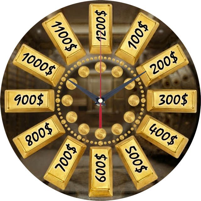 «Золотые слитки» — Стильные настенные часы с изображением золотых слитков и монет на фоне банковского хранилища, в золотистых и темных оттенках. Вместо цифр — золотые слитки с указанием номинала, черные стрелки и тонкая красная секундная. Подходит для в офис, в зал, в гостинную и станет оригинальным подарком для ценителей роскоши и бизнесменов. Подарите роскошь времени