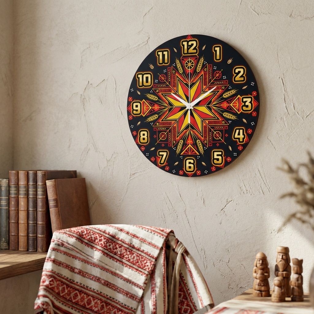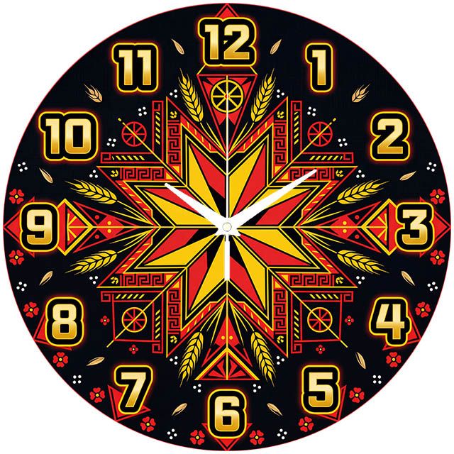 «Зоря Алатырь» — Стильные настенные часы с изображением древнеславянского орнамента «Зоря Алатырь», выполненные в черно-красных и золотистых оттенках. Крупные золотистые арабские цифры и контрастные белые стрелки обеспечивают отличную читаемость. Изделие идеально подходит для зала, гостинной или офиса и станет символичным подарком для родных и близких, а чтобы ознакомиться с другими вариантами, посетите наш каталог часов.