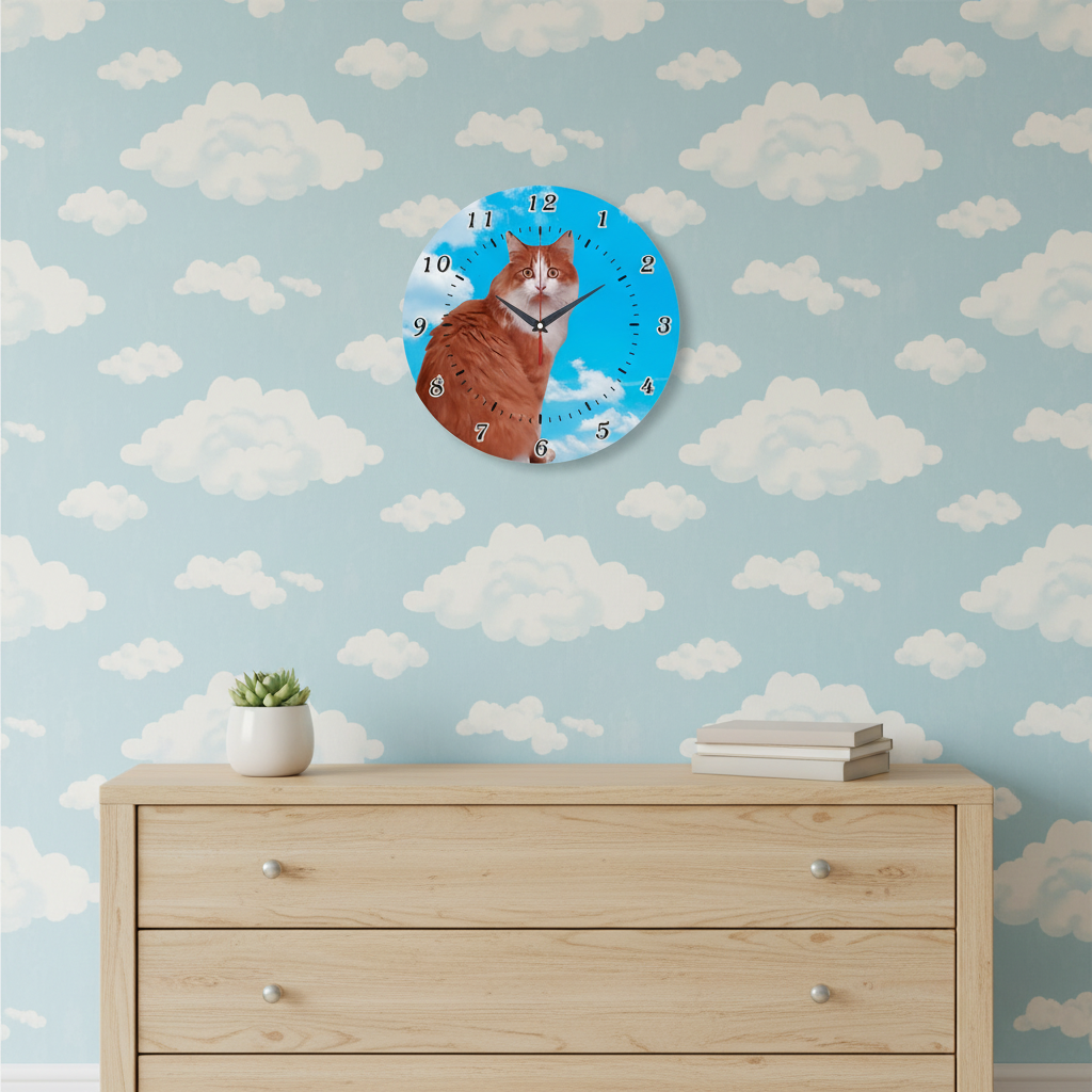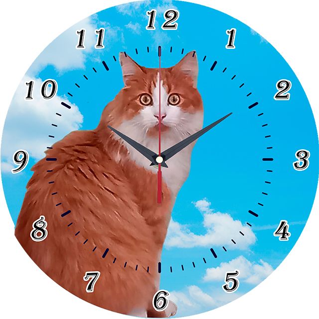 «Заказать часы с любимым котом» — трогательные настенные часы с портретом рыже-белого кота на фоне голубого неба с облаками, в ярких голубых и рыжих оттенках. Классические цифры и контрастные тёмные стрелки хорошо читаются. Подходит для любой комнаты любителя кошек и станет прекрасным подарком для владельца пушистого друга, напоминая о нём каждый час. Хотите часы с фото своего питомца? Мы можем изготовить их для вас! Выбирайте, какой выбрать настенные часы.