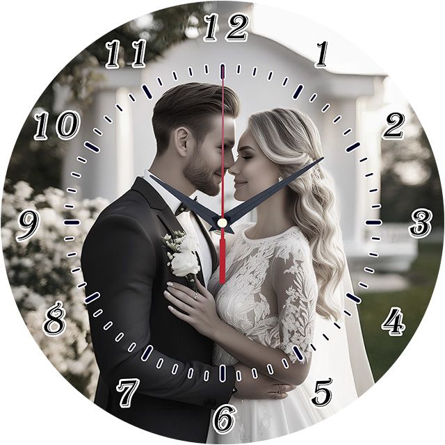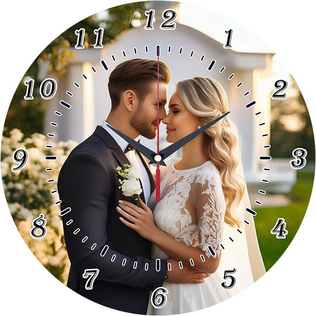 «Заказать часы со свадебным фото» — нежные, романтичные настенные часы с фотографией счастливой пары в день их свадьбы в тёплых, светлых тонах. Классические тёмные цифры и контрастные тёмные стрелки хорошо читаются. Подходит для спальни, гостиной и станет прекрасным подарком на годовщину свадьбы или молодожёнам. Хотите часы с вашим собственным свадебным фото? Мы можем изготовить их для вас! Выбирайте, где купить настенные часы.