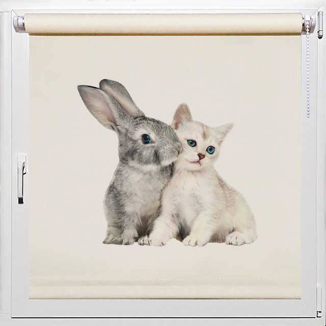 Милый котёнок и крольчонок, фото на рулонные шторы в спальню Rollpic 7004.Тотемы 2023 года Кролик и Кот - это домашние животные, их задача приумножить домашнее хозяйство и семейное благополучие. Они не любят потрясений, поэтому стремятся сделать 2023 год спокойным и миролюбивым. Чтобы привлечь домой птицу счастья, астрологи рекомендуют окружать себя символикой года. Фото котика и кролика на рулонных шторах в спальне, принесёт нежность и любвеобилие в семью! Сделаем под заказ любое фото по Вашему желанию!
