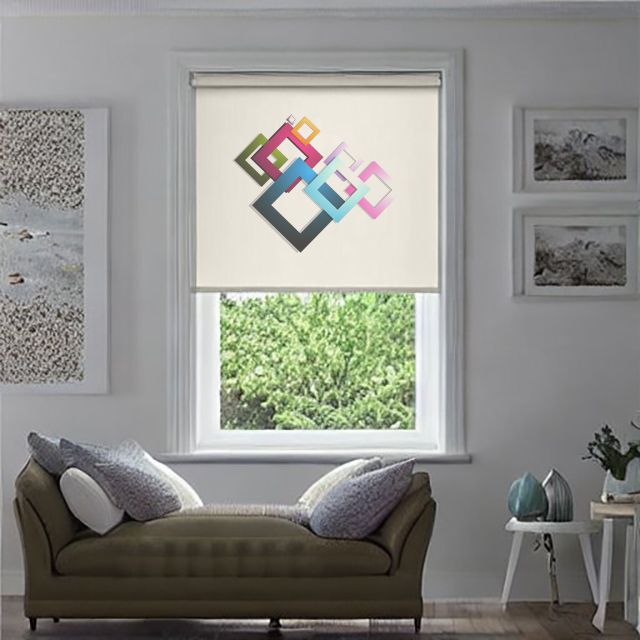 Купить рулонные шторы для окон в стиле минимализма с картиной кубизма в виде цветных квадратов.