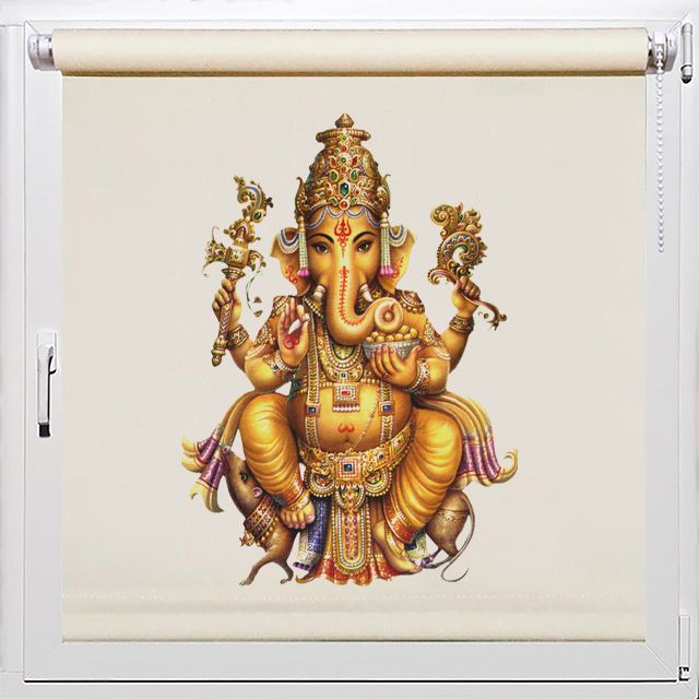 Колоритная рулонная штора в зал с картинкой статуэтки индуистского бога процветания и мудрости Ганеша. Могущественный талисман в индийской культуре защищает от неприятностей и приносит в дом успех и богатство.