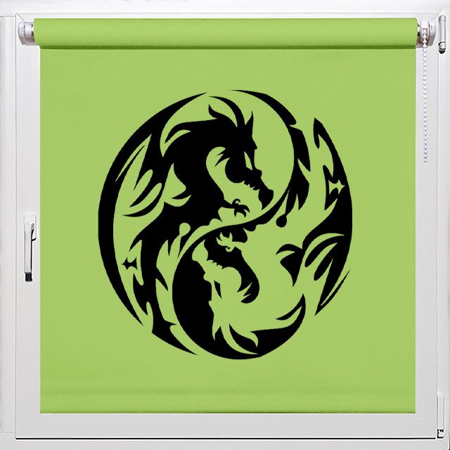 Рулонные шторы выполнены в стиле Инь и Янь символизирующим баланс и гармонию противоположностей. Они украшены чёрным изображением двух драконов на фоне ткани Лён салатового цвета. Это не просто декор, а ещё и мощный символ защиты и равновесия энергий. Драконы по фен-шуй известны своей способностью охранять от неприятностей жилище и привлекать положительные потоки успеха и процветания!