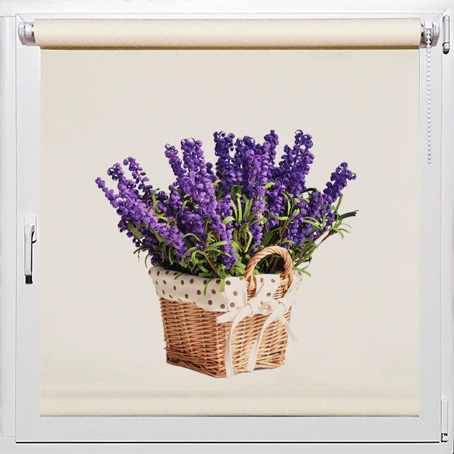 Душевные рулонные шторы на окна Rollpic 3008 в стиле Прованс. Картина в сиреневых тонах с изображением плетёной корзины и имитацией букета цветов лаванды.