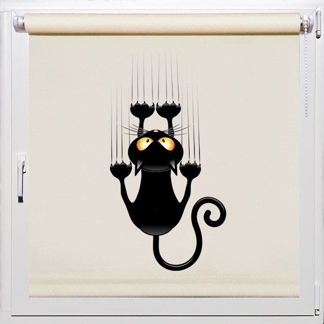 Прикольные жалюзи на кухню Rollpic 1043 с черным пакостным котенком. На жалюзи изображен гиперактивный, непослушный котенок. Он выпрыгнул на окно, вдряпался когтями в ткань жалюзи и пытается спустится. На эту картинку невозможно смотреть без улыбки. Забавные жалюзи на кухне доставят удивление и радость Вашим близким и родным!