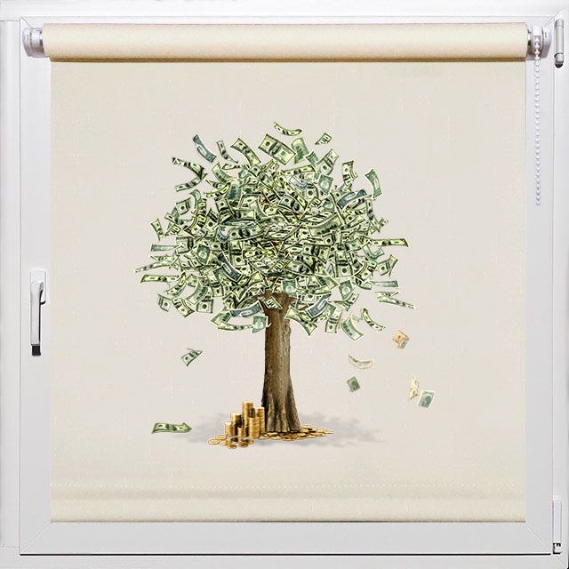 Богатые ролл шторы на кухню Rollpic 1052 с иллюстрацией денежного дерева. На шторах изображено дерево с листьями из американских денежных знаков. Ролл-шторы с картинкой денег - символизируют богатство и благополучие. Этот талисман в виде денежного дерева придаст вашей кухне необычный вид и будет притягивать деньги в Ваш дом!