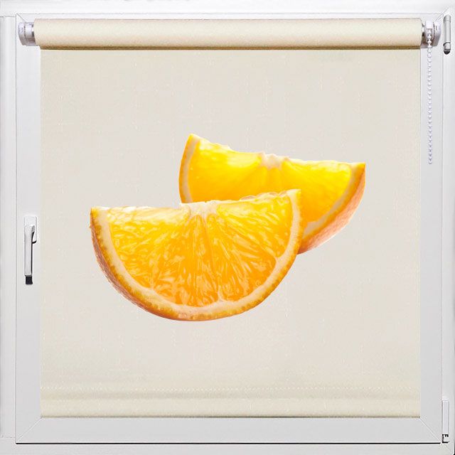 Рулонные шторы на кухню с изображением долек апельсина.