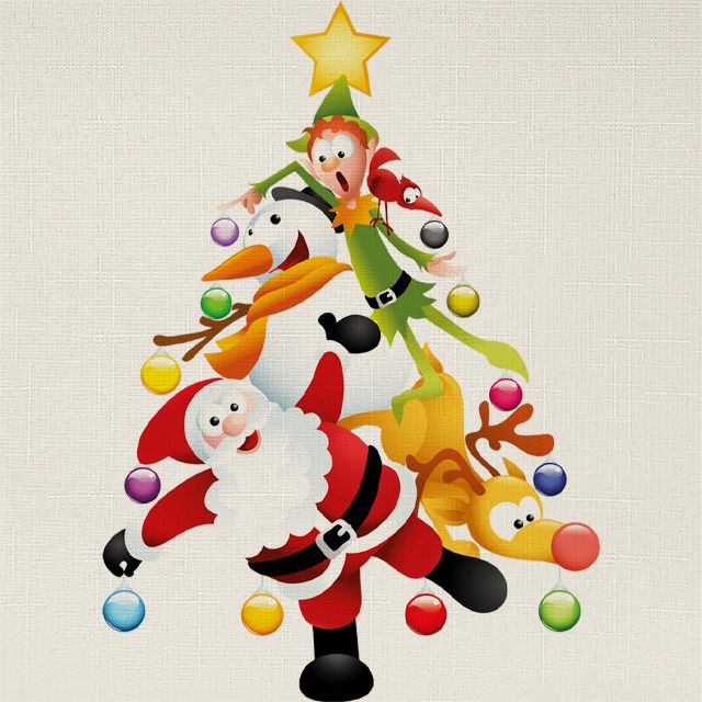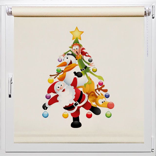 Удивительные жалюзи с детским рисунком, Rollpic 2023. Новогодняя картинка в виде ёлки из детских новогодних персонажей. Весёлые акробаты - Санта Клаус, снеговик, олень и эльф - очень стараются для Вас!