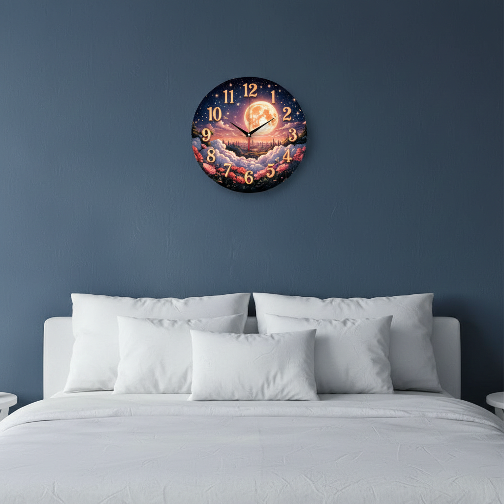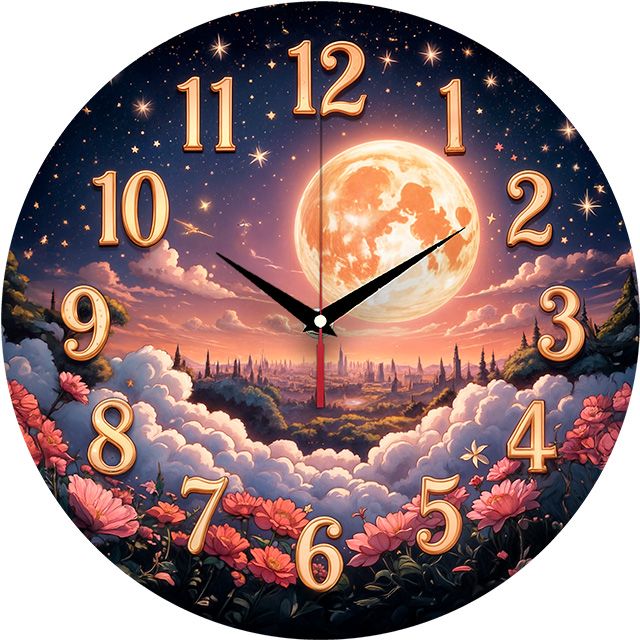 «Місячна ніч» — чарівний, казковий настінний годинник із фантастичним пейзажем: величезний місяць, хмари, квіти та далеке місто у теплих помаранчевих, рожевих та глибоких синіх відтінках. Великі золотисті цифри та контрастні темні стрілки добре читаються на мальовничому тлі. Пасує для спальні, дитячої кімнати або вітальні та стане чудовим подарунком для мрійника або любителя фентезі. Купуйте у нашому інтернет-магазині настінних годинників.